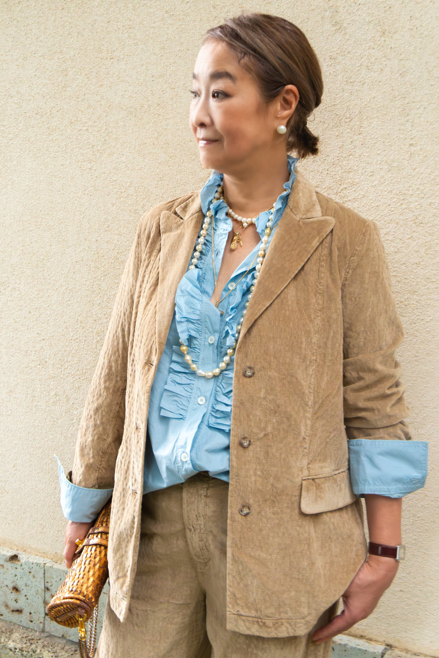 コーデュロイ素材で仕立てたセットアップは、秋らしいぬくもりとカジュアルな抜け感が魅力。 インナーには、さりげなくフリルをあしらったシャツを合わせて、きちんと感の中に女性らしさをひとさじ。