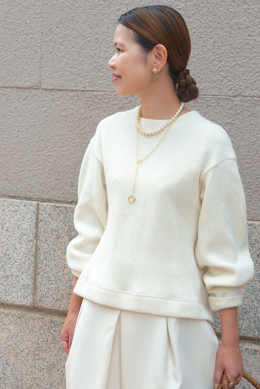 旬なバレルシルエットのスカートが主役! 立体感のあるフォルムが、甘すぎず上品な華やかさを演出。 トップスには、一見シンプルながらもデザインが効いたニットを合わせて、女性らしい印象に。