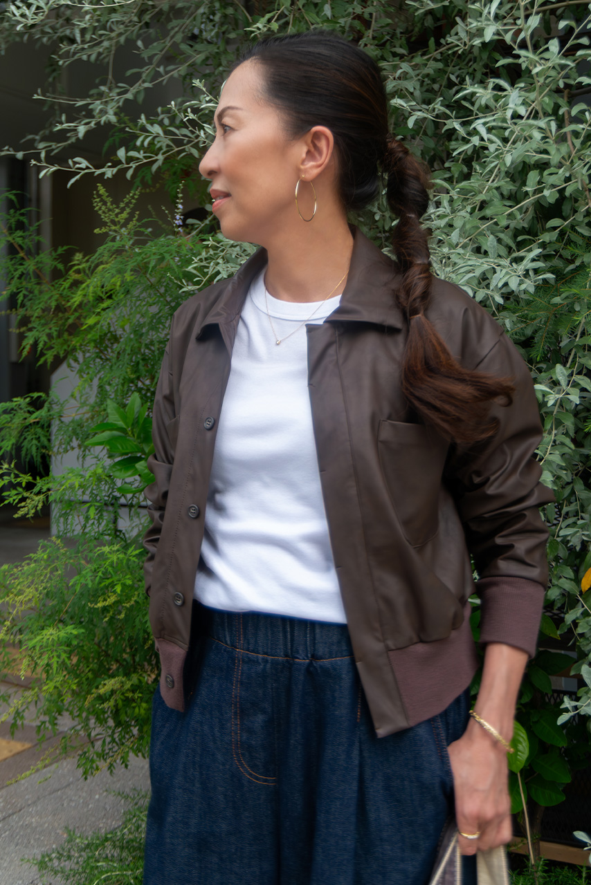 マットなエコレザーのブルゾンに、ワイドデニムを合わせた大人のカジュアルスタイル。 コンパクトなトップスとのメリハリが、シルエットに洗練されたモード感を生み出します。 インナーは白のシンプルなTシャツを合わせて抜け感を添えて、全体を軽やかに。